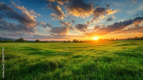 vibrant green meadow at sunrise or sunset the colorful summer sky and golden sunlight casting a warm glow over the wide tranquil landscape creating a peaceful and beautiful.