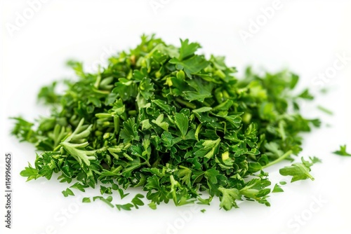 Vibrant green parsley leaves, freshly chopped and piled, creating a small mound against a clean white backdrop, perfect for culinary projects