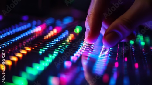 Vibrant Hand Adjusting Colorful Sound Mixer Controls at Night