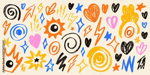 Vibrant hand drawn abstract shapes and symbols with hearts stars and lightning bolts