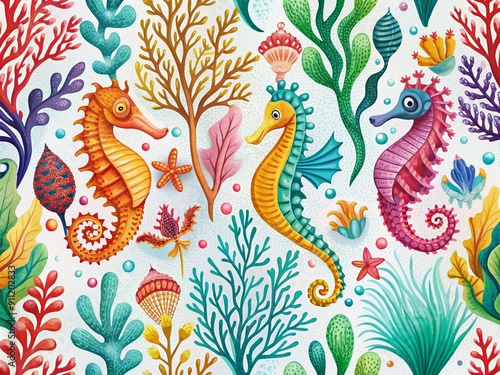 Vibrant hand-drawn tropical design featuring colorful seahorses, corals, and seaweed on a crisp white background, perfect for summer-themed graphics and designs.