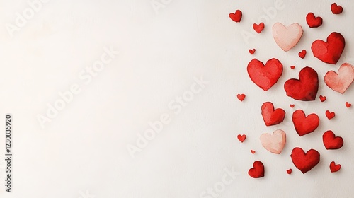 Vibrant hand-painted red hearts with gradient watercolor effects overlapping gently on a neutral background, radiating love and charm