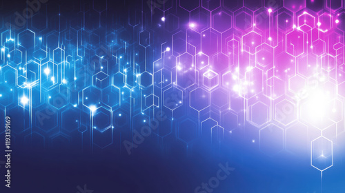 Vibrant hexagonal patterns with glowing lights in blue and pink hues create dynamic digital background. Perfect for technology and abstract themes