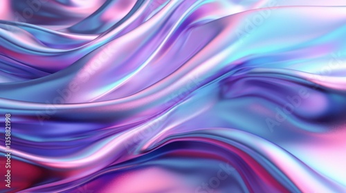 Vibrant holographic fabric flows with wavy patterns, reflecting dynamic lighting that enhances intricate details and creates a stunning, immersive atmosphere.