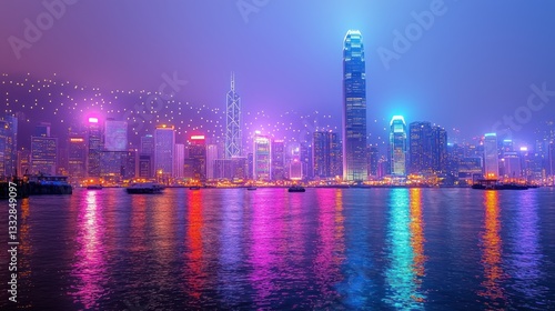 Vibrant Hong Kong Skyline at Night: A Dazzling Display of Lights and Reflections