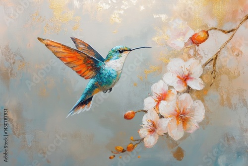 Vibrant hummingbird in flight near delicate, blossoming flowers, painted with impasto technique.