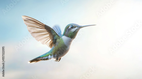 vibrant hummingbird with iridescent green feathers hovers gracefully against soft, glowing sky, showcasing its delicate wings and slender beak in mid flight