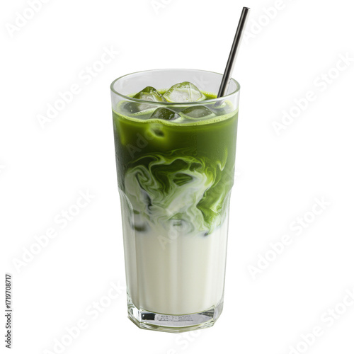 Vibrant iced matcha latte with emerald green matcha swirled with white milk in a tall clear glass, ice, and a silver straw on a transparent studio background, copy space. Concept for healthy