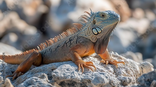 Vibrant iguana sunbathing on sunlit rocks, its textured skin blending with the rough stone surface beneath it