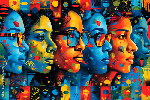 Vibrant illustration featuring diverse individuals wearing glasses, showcasing unity and diversity against a colorful, leafy background.