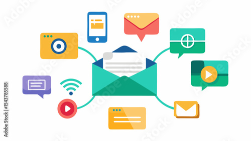 Vibrant Illustration of Email Marketing with Diverse Digital Channels and Communication Methods Connected to a Central Message