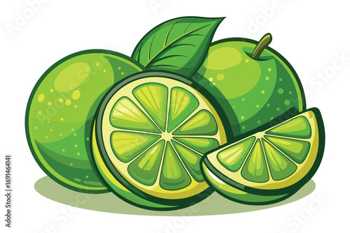 Vibrant illustration of fresh green limes with leaves one whole lime cut in half and a wedge