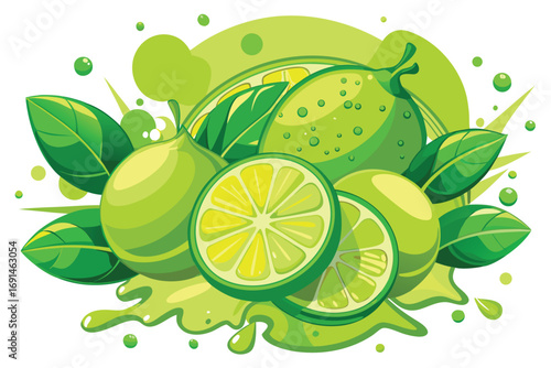 Vibrant illustration of fresh whole and sliced limes with green leaves and splashing juice