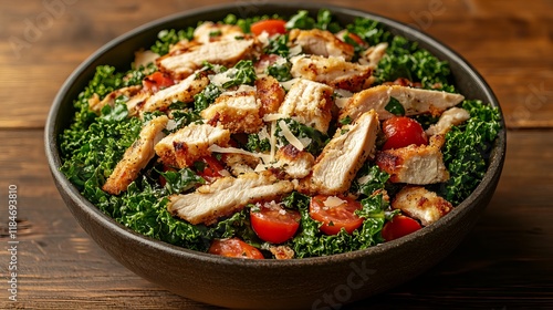 Vibrant Kale Salad with Crispy Chicken, Cherry Tomatoes, Parmesan, and Rustic Croutons