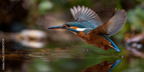Vibrant kingfisher hovers above stream, poised to dive with its wings spread wide and focused gaze. scene captures bird agility and serene water below