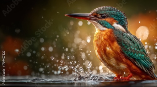 Vibrant Kingfisher Perched Near Water Splashes, Detailed Plumage and Sharp Focus Wildlife Portrait