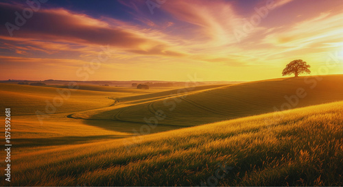 Vibrant Landscape Scene with Tree in Rolling Hills, Nature Photography, Tranquil Environment, Wide-Angle View