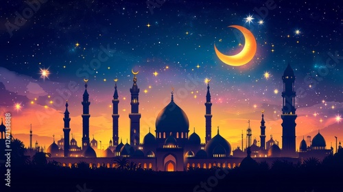 Vibrant lanterns glow warmly during Ramadan, celebrating the holy month. A crescent moon shines above beautiful minarets in a starry sky, creating a peaceful atmosphere