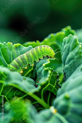 Vibrant Leafy Plant with Caterpillar Larva in Focus