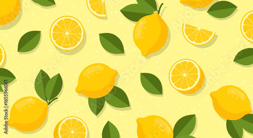 Vibrant Lemon Pattern with Green Leaves and Yellow Background.