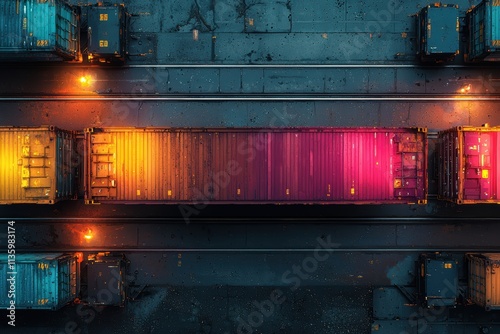 Vibrant logistics ecosystem featuring seamless transport of colorful containers urban freight yard aerial view high fidelity concept