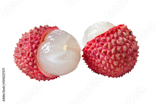 Vibrant lychee fruit showcasing its unique texture and juicy flesh against a stark white background in well-lit conditions