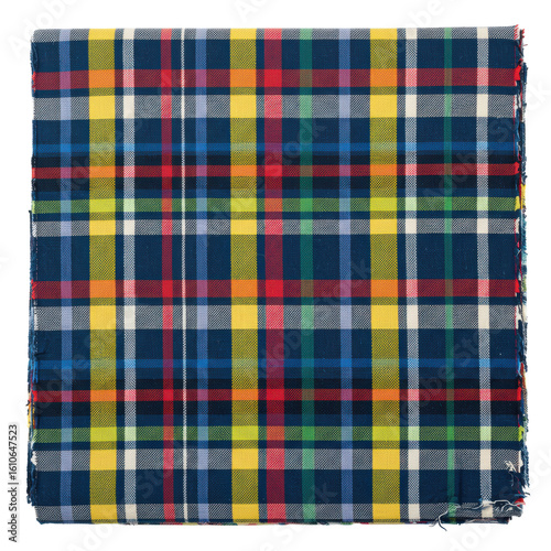 Vibrant Madras plaid cotton fabric, flat, unfolded, uneven checks and stripes, natural texture visible, isolated on a clean white studio background. Concept for textile product photography