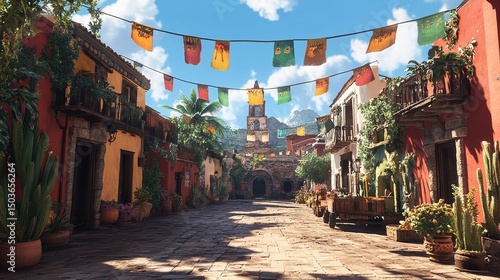 Vibrant marketplace scene, bustling with activity, filled with colorful displays of goods. A warm, sunny day. Ancient architecture and street .