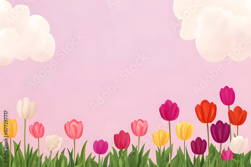 vibrant meadow of tulips blooming in various colors under pink sky with fluffy clouds. This cheerful scene evokes sense of joy and tranquility