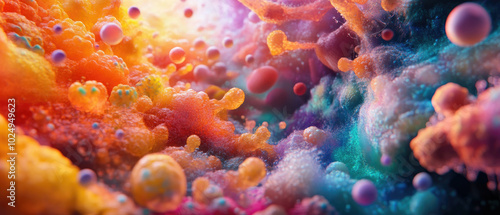 Vibrant Microbial Dreamscape, a surreal blend of colorful microscopic organisms and imaginative landscapes, evoking the wonders of microbiology.
