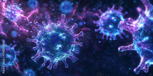 Vibrant microscopic view of viruses showcasing intricate structures and glowing colors, representing complexity of viral life