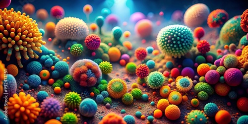 Vibrant microscopic world with colorful microorganisms and abstract forms, microscopic, vibrant, colorful, microorganisms