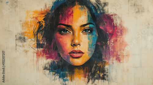 Vibrant mural showcasing a woman's face with artistic color blend on a wall in an urban setting. Generative AI