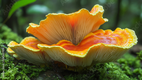Vibrant mushroom with orange and yellow hues growing in lush, mossy forest, showcasing intricate gills and natural habitat filled with greenery