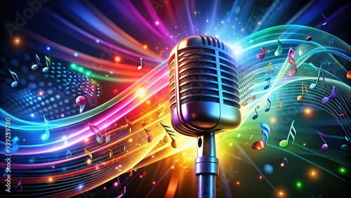 Vibrant music notes swirl around a lone microphone, capturing the essence of a powerful vocal performance in a dynamic and energetic musical composition.