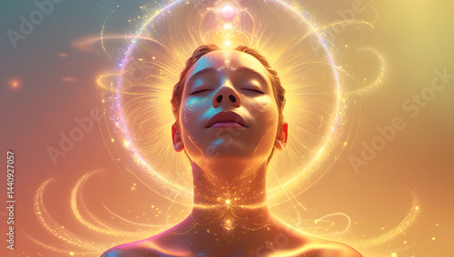 vibrant, mystical illustration of a person surrounded by a radiant aura, exuding energy and harmony, with delicate, swirling patterns of light and color emanating