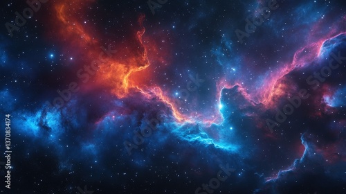 Vibrant nebula swirls of blue, red, and gold illuminate a breathtaking deep space vista. A stunning starry backdrop completes the cosmic scene