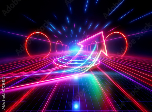Vibrant neon arrow pointing forward in a tunnel of glowing circles and grid lines. Double exposure effect creates a futuristic and dynamic perspective.