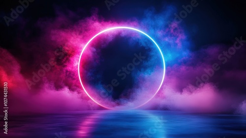 Vibrant neon circle surrounded by colorful mist creates a surreal atmosphere