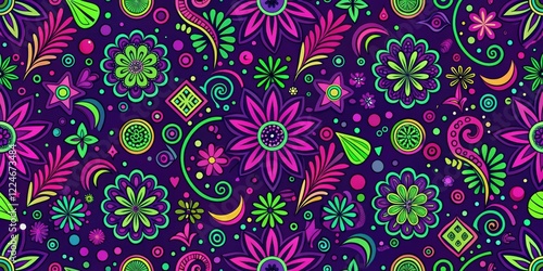 Vibrant Neon Floral Pattern with Psychedelic Swirls and Geometric Shapes for Textile Design