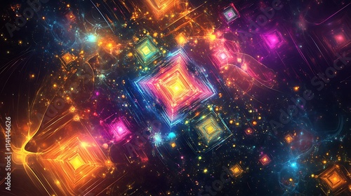 Vibrant Neon Geometric 3D Render: Abstract Digital Artwork. AI Generated