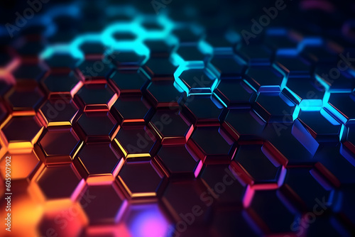 vibrant neon glowing abstract futuristic background with honeycomb shape in the black background with little bokeh light in the black background. Generative ai.