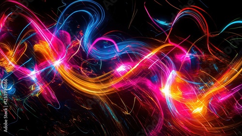 Vibrant neon light trails in dynamic motion on dark abstract background