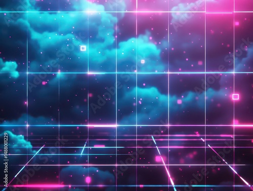 Vibrant Neon Lights Illuminating Dark Background Surrounded by Ethereal Clouds Creating a Futuristic and Dreamlike Atmosphere in Urban Setting