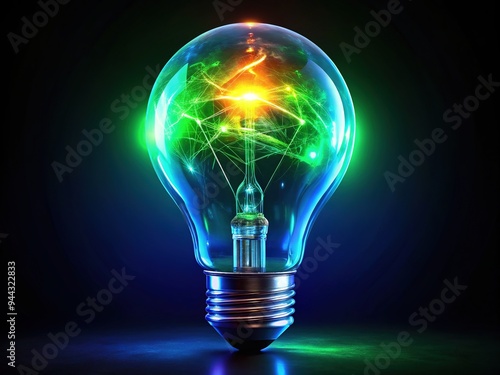 Vibrant neon-lit lightbulb radiates electric blue and green hues, suspended in darkness, emitting a mesmerizing glow, symbolizing innovative ideas and creative energy.