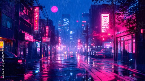 Vibrant neon-lit street scene at night in a rainy urban setting.