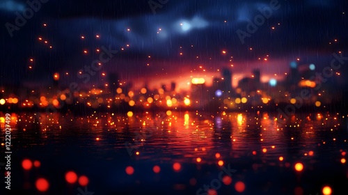 Vibrant Night Cityscape with Reflections and Colorful Light Bokeh