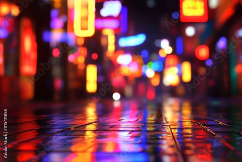Vibrant night scene with colorful neon lights reflecting on wet pavement in an urban setting.