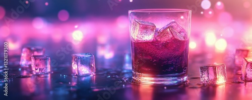 Vibrant nightlife scene with glass of whiskey and ice cubes on reflective surface