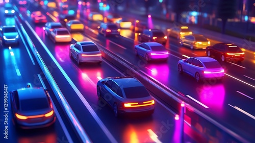 Vibrant Nighttime Traffic Scene with Colorful Lights Reflecting on Wet Road Surface